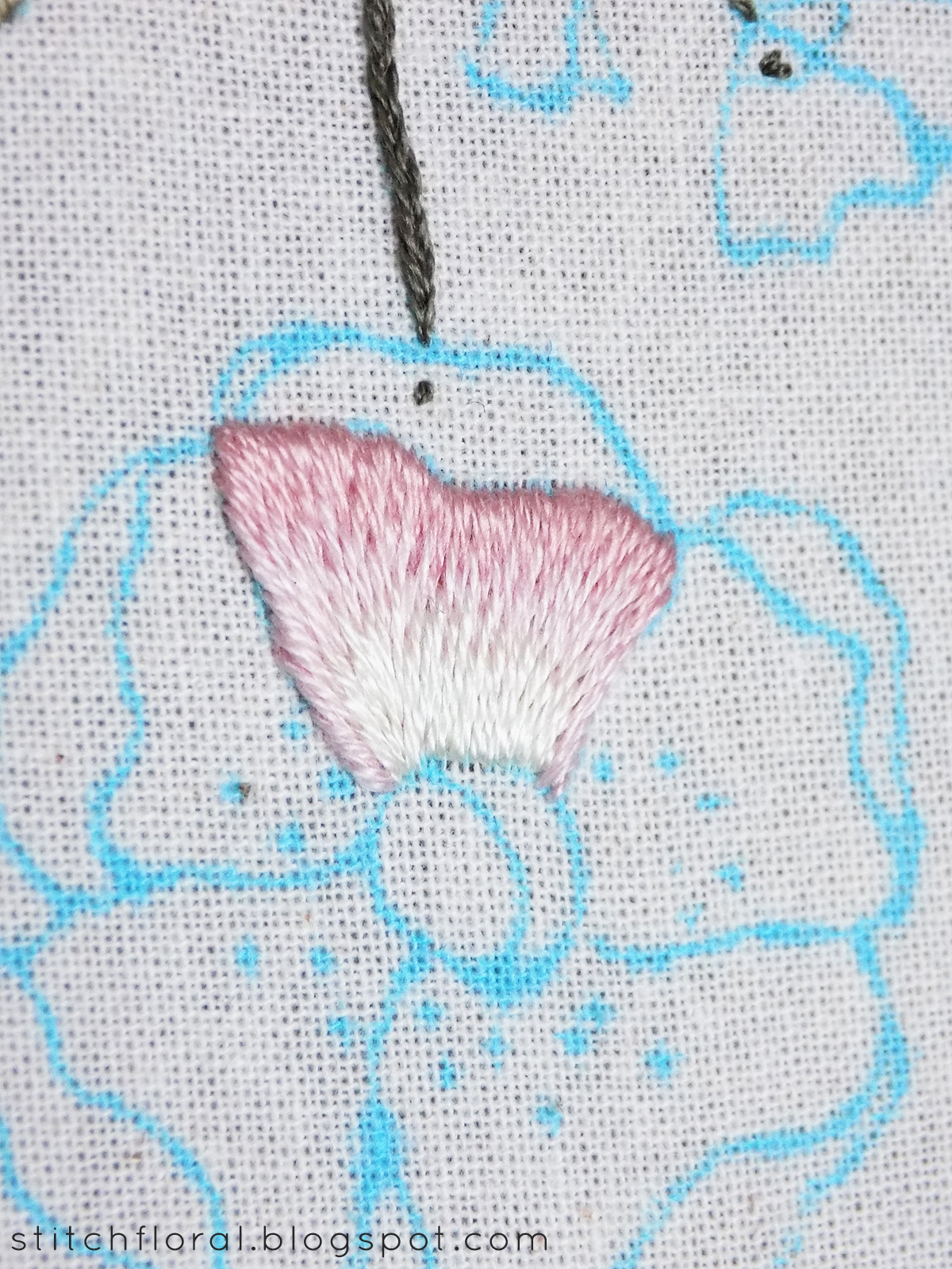 The main “body” of the petal is stitched using long & short stitch technique, and only 1 strand of floss.