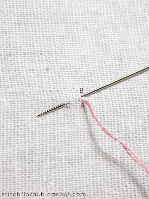 But the actions are the same. We bring the thread to the surface of the fabric at point A, insert it at point B which lies somewhere near to A, and then come back up through the fabric at point C (which is a stitch length away), tucking the thread under the needle shaft from above.